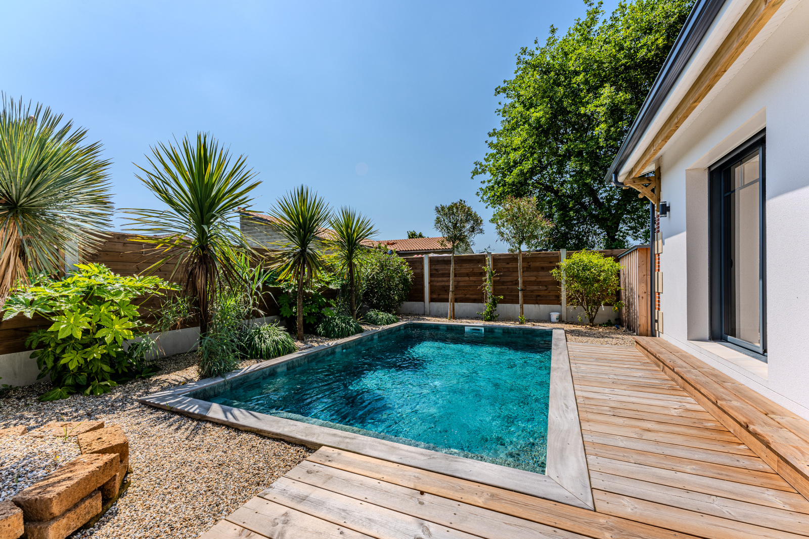 Le jardin, entièrement cloturé est joliment paysagé, terrasse bois avec piscine, stationnements en enrobé.