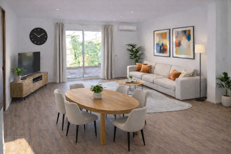 comprenant quatre chambres (dont deux parentales), salle de bains, pièce de vie avec cuisine équipée,