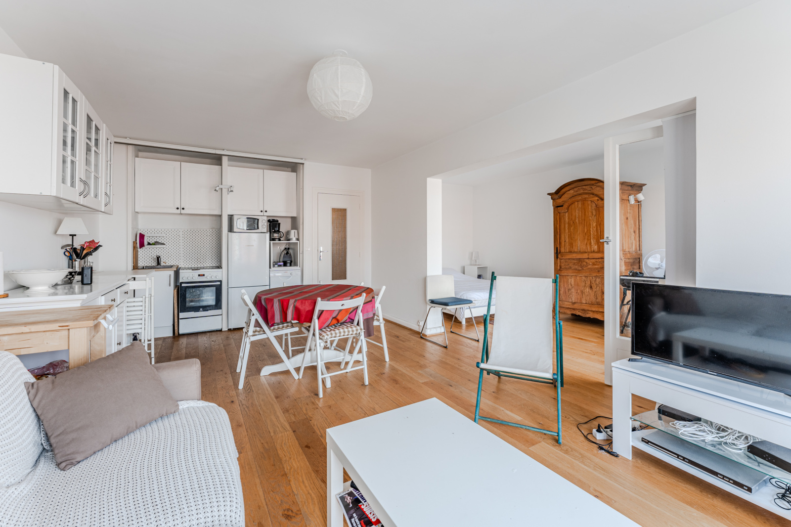 Côté Ouest, avec une vue dégagée sur les toits et un très bel aperçu sur le bassin, l'agréable pièce de vie et une chambre en alcove donnent sur la terrasse couverte et un balcon.