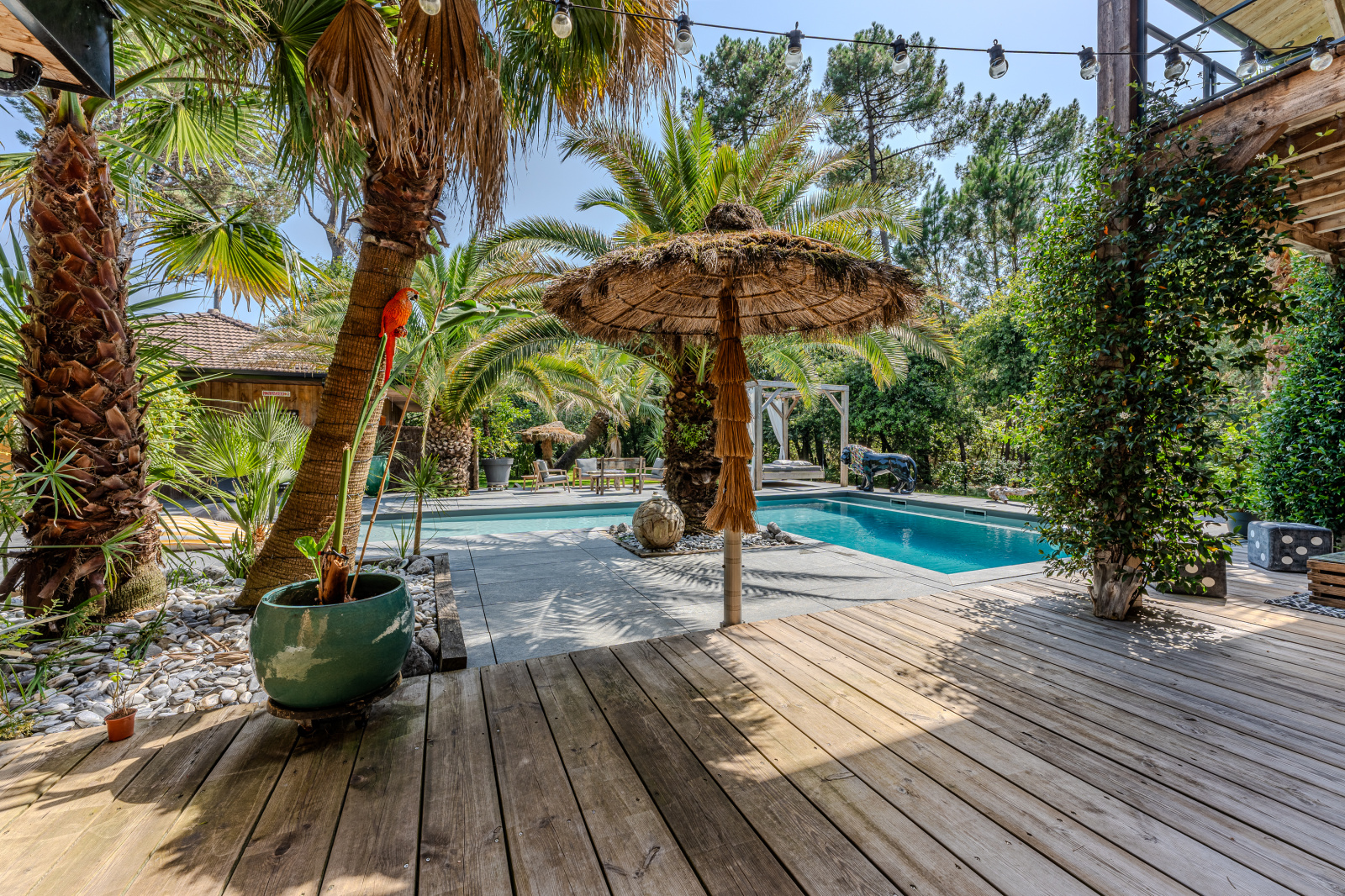 Les extérieurs ne sont pas en reste, le parc, entièrement clôturé, mêlant les essences locales et exotiques,