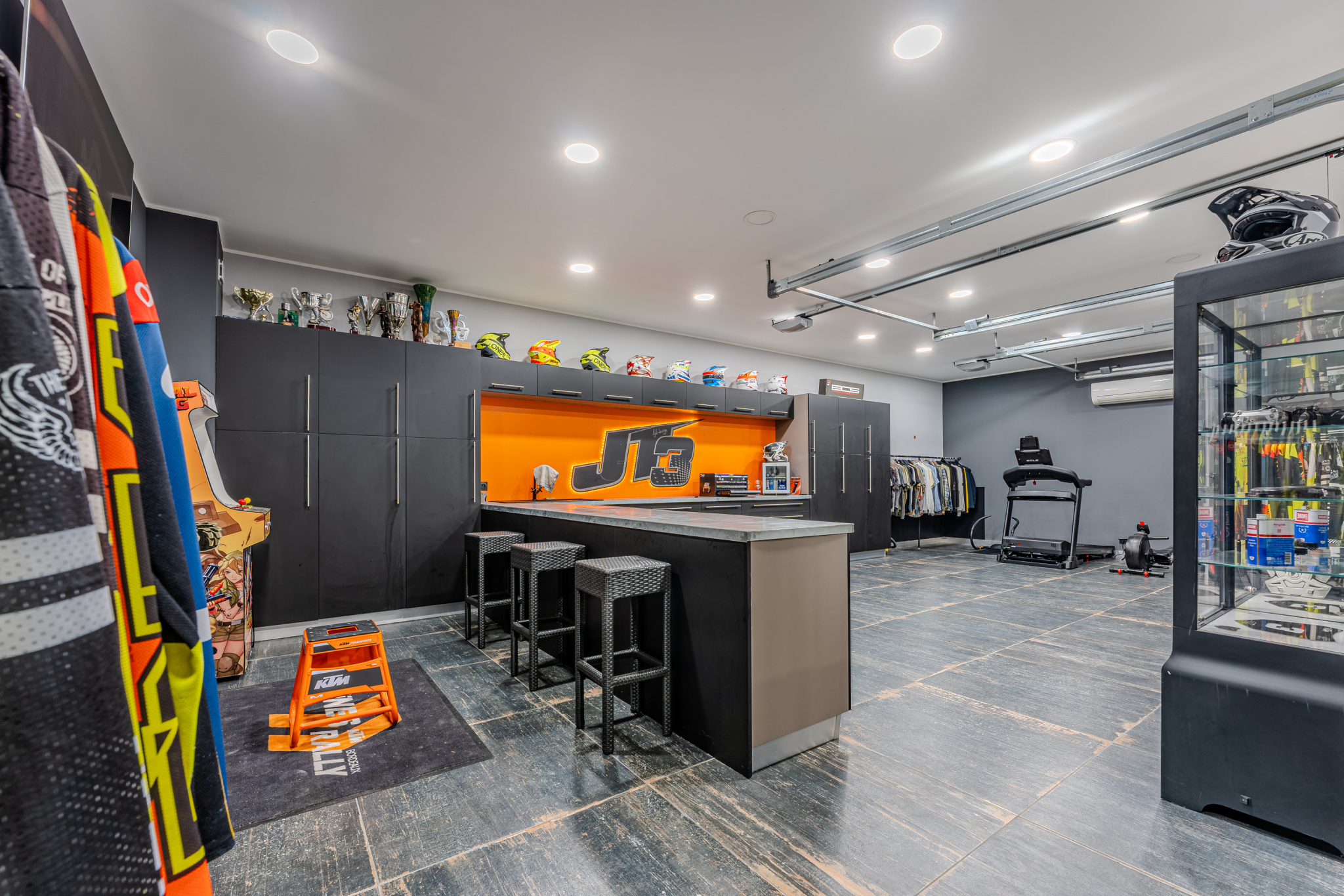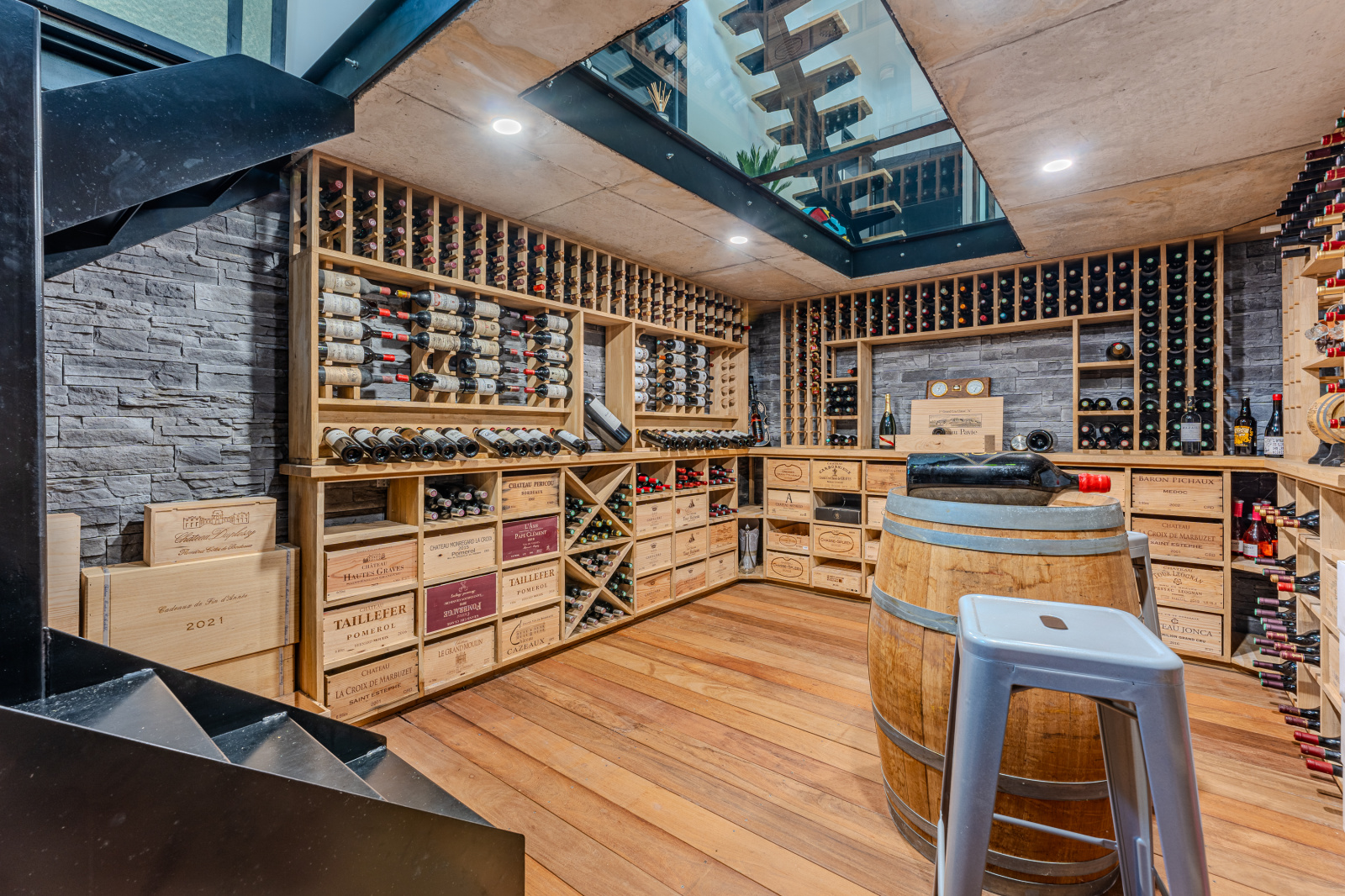 Vous aurez accès au vaste garage double (carrelé, isolé, climatisé) et à la surprenante cave à vin avec son plafond de verre.