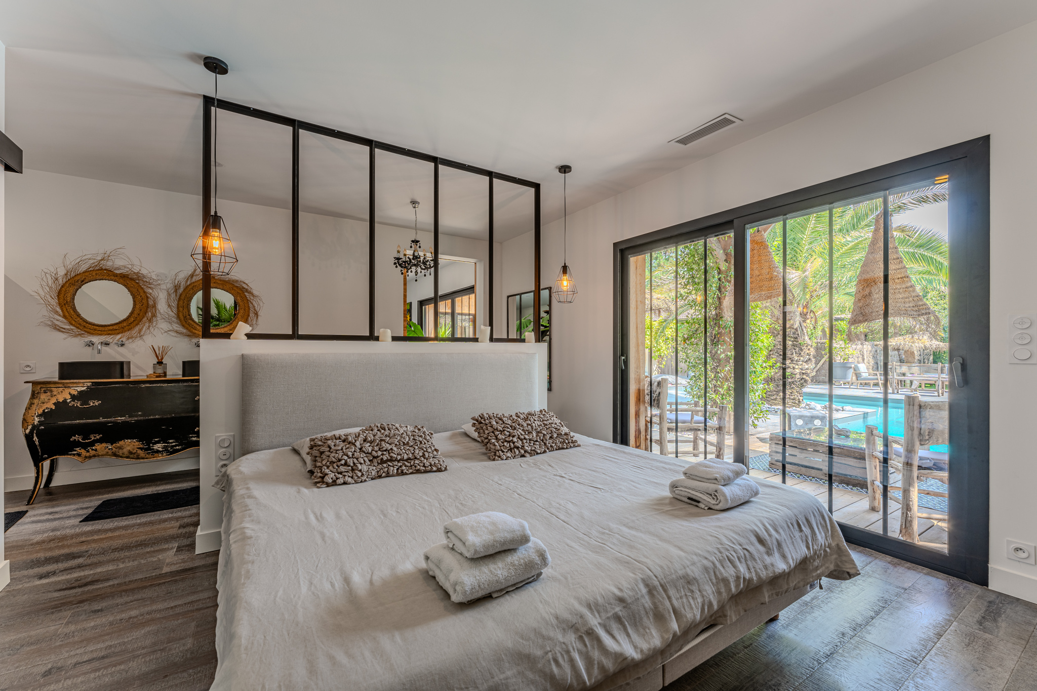A l'étage, un espace détente, salle d'eau et trois autres chambres dont une avec terrasse donnant vue sur le parc paysager.