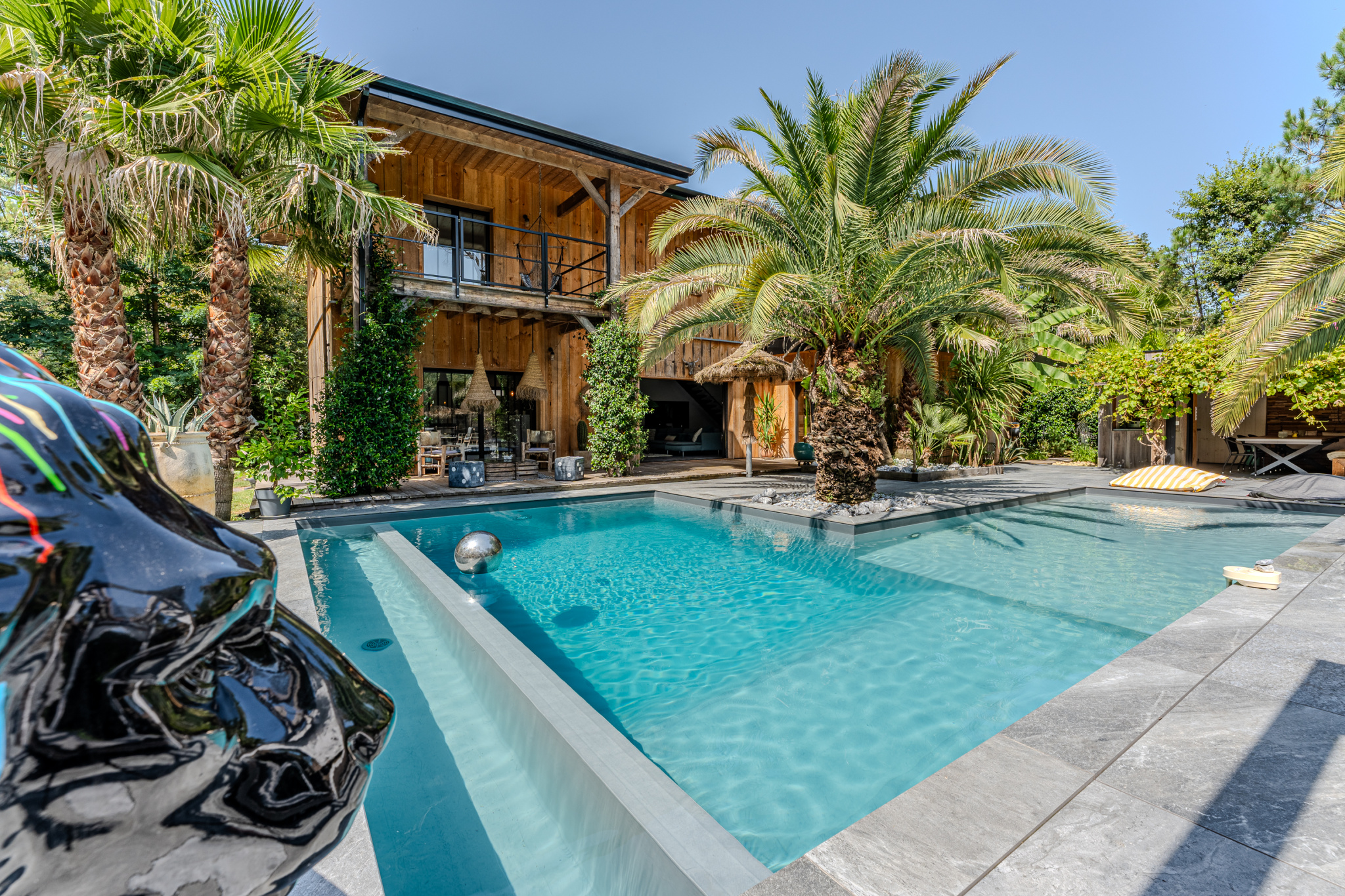 ceinture une belle terrasse avec piscine, cuisine d'été, boulodrome et aires de stationnement en pavés de granit.